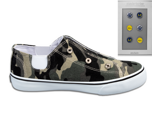 Everyone's favorite easy to to slip on low top sneaker with cotton canvas upper and rubber sole come with 1 set of twist on and off embellishments.