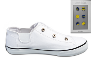 Everyone's favorite easy to to slip on low top sneaker with cotton canvas upper and rubber sole come with 1 set of twist on and off embellishments.
